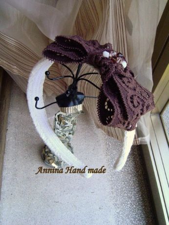Cerchietto in pizzo bianco con fiocco in pizzo marrone e swarovski in tinta