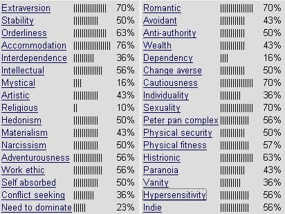Extraversion results were high which suggests you are overly talkative, outgoing, sociable and interacting at the expense too often of developing your own individual interests and internally based identity.