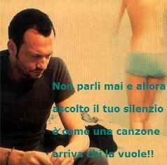 mercoledì 11 luglio 2007 - ore 15:13 Eri andato troppo avanti! Sì, con le ombre! Senti un leggero debole! Sì, mangia meglio! (già un mese fa, esatto per altro, o forse anche da sempre, era abbastanza intuibile..) che ho ragione?? quello sempre.. fin’ora.. ..qui non si diventa e non si inventa.. Qui.. ..Qui la parola chiave è.. Casualità.. LEGGI I COMMENTI (2) - PERMALINK sabato 7 luglio 2007 - ore 02:25 Finalmente è finita sta sessione d’esame più che discretamente.. e questo è già buono.. Per qualcosa del resto ci sarà più tempo.. ![]() ![]() ![]() Buon riposo, buon relax, e ![]() LEGGI I COMMENTI (14) - PERMALINK giovedì 14 giugno 2007 - ore 00:00 ![]() ![]() ![]() ..ke bene.. LEGGI I COMMENTI (3) - PERMALINK lunedì 11 giugno 2007 - ore 16:19 Sarebbe Bello Mi dici... No non voglio più non voglio piangere Sono stanca di non vivere per lui.... Cosa posso fare tu consigliami Se tu fossi lui... mi chiameresti o no...o no... allora dai raccontami chi è quel tale che sa spegnere il sorriso. . . . . .di una come te non ti chiama.. non ti chiama... se qualcosa scappa sempre.... prova a non seguirla più! Ti dico... Cara io conosco il mondo maschio E’ un mondo fragile con forti controsensi Cara chiama tu... E parla chiaro. E non aver paura di sentirti dire quello...quello che sai... quello che sai... Stringimi mi dici.... si.... Ti stringo e poi Mi piacerebbe darti il mondo...è una questione di coraggio I tuoi occhi perdono due lacrime… i miei occhi sono stelle e fanno ombra alla tua pelle Cara io conosco il mondo maschio E’ un mondo che si arrende...alla personalità Se bastassero due piccole carezze A farti addormentare vuota di pensieri...Come vorrei... come vorrei!! Sarebbe bello ridarti un’idea Sarebbe almeno una cosa mia Bella che a me... basterebbe metà Pensa che sogno se fossi miaaa No non devi più non devi piangere L’amore tu lo sai... dai a lui... "solo quello che tu sei" e da lui pretendi il gioco, e a tratti un po’ di verità. Ti dico... Cara...io conosco il mondo maschio E’ un mondo fragile con forti controsensi cara basterebbe che il tuo pianto arrivasse a lui, come una tempesta... e riderai...e riderai Sarebbe bello ridarti un’idea Sarebbe almeno una cosa mia Bella che a me... basterebbe metà Pensa che sogno se fossi miaaa Sarebbe bello ridarti un’idea Sarebbe almeno una cosa mia Bella che a me... basterebbe metà Pensa che sogno se fossi mia ..ghgh..cmq sì, so fine.. LEGGI I COMMENTI (5) - PERMALINK venerdì 8 giugno 2007 - ore 22:40 Nonostante la pioggia che ci ha sommerso durante tutto il primo pomeriggio e la mia, ormai cronica, stanchezza.. c’eravamo anke quest’anno.. Nn male dai, anche se niente a ke vedere con gli anni scorsi.. 1po’ x il tempo, 1 po’ per le mie condizioni -Clà, nn mi corrompi più! Prprprrprrrrrrrrrrr!- Ma nn potevo mancare di salutare 1po’ di gente.. Peccato ke qualche presente nn mi abbia avvisato della sua..presenza.. ma bene così.. All’Agriparty a Cocacola è davvero più unica ke rara ![]() Bacio Lauretta ![]() Bacio Silvy.. Botte ad Alex (ed anche al compare Alessandro..ghgh..).. Ciao a tutti gli altri.. LEGGI I COMMENTI (3) - PERMALINK giovedì 7 giugno 2007 - ore 14:17 ![]() ..meglio di quanto mi aspettassi..sì.. In attesa forse di un quarto, lo spazio cè.. Ma.. ![]() ..ke personaggio..è troppo bellissimo !!(ho la vaga impressione che sta durando da tempo.... ..è una diretta trasmissione di passione e antica gelosia mai uguale al giorno prima e con paura di non domani..) LEGGI I COMMENTI (3) - PERMALINK lunedì 4 giugno 2007 - ore 23:22 ....A volte sono solo e a volte se mi siedo non ci sto A volte sono un cane sciolto che non abbaia più A volte cazzo quante cose ancora da decidere A volte ho te, a volte no A volte è tutto così bello che mi sembra impossibile A volte si….a volte no… Per chi ama la vita Per chi ha troppe domande Per chi come me sente troppo Per chi deve qualcosa Per il trucco che a fine serata… Ti fa tornare perfetta… Per quell’uomo che aveva ragione E che portava il tuo nome…………… A volte è un mondo che ci fa…sembrare bella l’america A volte scelgo il meno peggio…..però non vince mai A volte ancora ’bella ciao’… e mi vengono i brividi Anche se non …la canto mai A volte penso che ogni cuore…abbia un soffio nascosto A volte ho te……a volte no.... Quanto mi piace quell’uomo!! ....LEGGI I COMMENTI (3) - PERMALINK sabato 2 giugno 2007 - ore 22:17 ![]() Primo capitolo dell’originale Usa Grindhouse di Tarantino (Death Proof) e Rodriguez (Planet Terror).. in versione allungata a 140’.. Qualche parte 1po’ lentina.. ma ci stava.. Splatter-vintage anni ’70 riuscito ottimamente!! ![]() ![]() ![]() LEGGI I COMMENTI (2) - PERMALINK sabato 26 maggio 2007 - ore 13:13 But Friday never hesitate... ..oh, bellissima.. COMMENTA (0 commenti presenti) - PERMALINK sabato 26 maggio 2007 - ore 01:30 E sto tornando operativa! Sì, sono una roccia NK! ![]() ![]() ..ahahahah.. l’erba cattiva ..1bacino a tutti quelli ke sanno ke gli voglio 1sacco di bene! E ke sono stati iper carinissimi! ..di nuovo in pista.. ![]() *°*°*°*°* Ti senti molto sicura tu si vede da come cammini ti muovi bene mi piace sai quel modo di fare che hai Dimmi che cosa prendi quando ti svegli dimmi che tipo di pillole mangi dimmi che cosa che cosa ti dà quell’inaccessibilità Dimmi ti prego cosa vedi nei sogni dimmi che tipo di dieta fai se metti zucchero nel caffè o se lo bevi così amaro com’è Dimmi se hai letto molti libri dimmi quando fai l’amore fingi... dimmi che cosa che cosa ti fai non dirmi che non ti droghi mai dai.. (E a te.. te ne voglio 1000 di sacchi, pieni pieni!! )COMMENTA (0 commenti presenti) - PERMALINK > > > MESSAGGI PRECEDENTI |