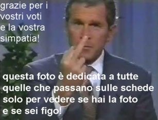 sabato 29 aprile 2006 - ore 23:09 Chattando LEGGI I COMMENTI (2) - PERMALINK sabato 29 aprile 2006 - ore 12:06 Cè chi... Si sdoppia pur di apparire.... COMMENTA (0 commenti presenti) - PERMALINK venerdì 28 aprile 2006 - ore 12:01 Tra me e te... RICEVUTO DA: ***** TITOLO: RE: RE: RE: RE: RE: RE: RE: RE: RE: RE: RE: Senza Titolo ORA: 28/04 - 11:58 MESSAGGIO: che figa... sei felice?! grazie, no non lo sono ma l’infelicità come quasi tutte le cose, è momentanea. ti vedo bella, vicino ad una porsche, ben vestita... fatti passare presto questa tua infelicità! c’è di peggio... certo, dipende sempre con che occhi si guardano le cose, di periodi un po’ bui ne abbiamo tutti e non è la bellezza, i bei vestiti o una bella macchina a farti sentire meglio. Cmq non vedermi così pessimista, non lo sono. l’importante è sapere di avere avuto delle occasioni e sapere di poterne avere ancora! Fare quello che si vuole è un lusso... vorrei capire meglio le tue ultime parole. Cmq di occasioni ne abbiamo sempre, basta saperle vedere e cogliere cosa ti permette di cogliere le occasioni? il fatto di credere in te stesso.. se uno ha dei punti di partenza gli riesce più facile. sapere che sei attraente, sapere che fai cose divertenti, avere argomenti di discussione... "Fare quello che uno vuole!" difficile da spiegare in poche righe. Cmq pensare una cosa e realizzarla... hai bisogno di un sorriso? chiedere e ricevere. qualcuno ti ha mai rifiutato un sorriso? Vorrei capire la tua frase "dipende con che occhi si guardano le cose"? niente di troppo filosofico e complesso. Intendevo dire che ci sono momenti in cui prendi le cose in modo pessimistico e negativo. Come ti ho detto prima, non mi reputo una persona negativa. E’ vero che l’infelicità spesso ce la creiamo e cerchiamo, come sta succedendo a me. Il modo di sorridere c’é sempre ma nasce da noi in primo luogo. Insomma stiamo dicendo le stesse cose... con parole diverse. ci complichiamo la vita, perchè la vogliamo più semplice. lo sò! ma accettare quello che viene non mi piace. non sò se capisci... sì credo di capire. Infondo se non rincorressimo degli obiettivi sarebbe impossibile darci un senso. Mmm certo che stamattina abbiamo proprio voglia di complicarcela la vita? ![]() e tu? Non mi hai detto se sei felice per ora no. ma nn smetto mai di sorridere alla vita! ![]() COMMENTA (0 commenti presenti) - PERMALINK mercoledì 26 aprile 2006 - ore 17:58 Ragazze.. I soliti consigli: "Se la cerchi non arriverà mai." "Tranquillizzati e aspetta che tutto arriverà." Voglio lamentarmi delle donne. E si... bisogna! Sarà mica possibile che un povero ragazzo deve fare tutta sta fatica per conoscere una ragazza. E non sto dicendo conoscerla per portarsela a letto, anche se è quello che LORO vogliono. Possibile che nn abbia nulla da dire e che cercano solamente quello con i soldi, o il figo o il palestrato... Mi fa incazzare pensare che quando sono loro ad avere desiderio devi esserepronto e disponibile... Ou.. ma scherziamo! Sono fuori di testa le ragazze di oggi! Ok... capisco che all’inizio sono uno sconosciuto, ma lo sono stati tutti i ragazzi con cui avete fatto al scuola, con cui vi siete trovate ad un corso o che avete conosciuto in vacanza. Voglio dire... non è la fine del mondo conoscere una persona nuova. E’ da un pò che ci provo, nel senso conoscere una persona dal niente. Se la cosa parte da una ragazza.. track eccolo la io sono disponibile. Ma se parte da me.. "Emh scusa ho il fidanzato", "scusa nn ho tempo ci vediamo", "ho appena bevuto qualcosa con il tuo collega" Insomma stronze da tutte le parti... capitano solo a me?! La cosa bella delle mie amiche e degli amici... "ma nn ti manca nulla", "stai tranquillo" "allora come va casanova..." Pigliate in giro? Fate sul serio?!!!! Bene... da adesso dichiaro guerra! E si l’avete voluto voi. Ad essere gentile, bendisposto e seri con voi donne serve solo a farsi passare per coglione. Vi piacciono gli stronzi che cagano alto... bene! L’avete voluto voi! E magari sono anche capace di divertirmi a farlo! CERCAVO SOLO DI CONOSCERVI.. ADESSO CERCHERO’ SOLO DI SCOPARVI! Nuovi consigli: "Alle donne piacciono gli stronzi.." "Le donne amano soffrire!" "Meno le caghi più le fai impazzire!" ![]() LEGGI I COMMENTI (2) - PERMALINK domenica 23 aprile 2006 - ore 18:32 IL PASSATO Foto di repertorio ![]() ![]() Se mio fratello sà che l’ho messo in internet... COMMENTA (0 commenti presenti) - PERMALINK giovedì 20 aprile 2006 - ore 19:20 CATENEEEEE... Il Dalai Lama disse: leggilo e saprai come sei. In verità funziona. E un test della personalità molto interessante. Fallo, sono solo 4 domande e le risposte ti sorprenderanno. E divertente farlo, ma dovrai seguire alla lettera le istruzioni. AVVISO : Rispondi al questionario a mano a mano; ti vengono richieste solo 4 domande. Se vedi tutto il questionario prima di terminare, non otterrai risultati onesti. Scorri lentamente verso il basso, riga per riga, e fa ogni esercizio con consapevolezza. Non guardare avanti. Procurati carta e penna per scrivere sotto le tue risposte. Ne avrai bisogno alla fine. Questo è un questionario onesto, che ti dirà molto circa il tuo vero IO. TEST Esprimi un desiderio prima di cominciare il test. Il Dalai Lama disse : Ordina i seguenti 5 animali secondo la tua preferenza: a. Colibrì b. Cavallo c. Farfalla d. Cane e. Uccello Scrivi una parola che descriva ognuno dei seguenti elementi: a. Cane b. Gatto c. Topo d. Caffè e. Mare Pensa a qualcuno che conosci e sia importante per te, e che puoi relazionare con i seguenti colori (non ripetere la tua risposta due volte, nomina solo una persona per ogni colore): a. Giallo b. Arancione c. Rosso d. Bianco e. Verde Infine, indica il tuo giorno preferito della settimana. Hai finito? Prima di controllare il risultato assicurati che le tue risposte siano ciò che tu REALMENTE senti. Guarda le interpretazioni sotto, ma prima di vederle, ripeti il tuo desiderio. Questo va a 