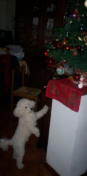 -una foto di pepe che invano cerca dia fferrare le palline dell’albero