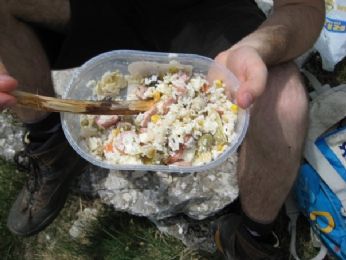 Quindi trovato un luogo che poteva ospitare tranquillamente lapprovigionamento della sperduta e affamata banda si è fermata e ha estratto il cibo(qui foto del dirupo su cui ci siamo appollaiati per mangiare) Chi aveva i soliti panini fatti, chi pane e affettato... Uno invece aveva la suprema arte dellinsalata di riso. Olio e maionese con del riso attorno.