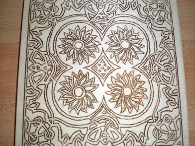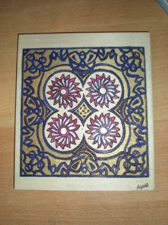 legno, pirografo, vernice oro e argento, china blu, matita acquerellabile