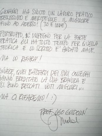 Son fuori dogni dubbio commosso, gasato e felice per questo riconoscimento al lavoro di 3 settimani di sonno forzato (cioè quando mi crollava la testa sulla tastiera dormivo), specie quando il prof. in questione, su richiesta di un riconoscimento scritto (visto che non ho registrato il voto, avendo fatto uno scritto osceno), ti scrive così: