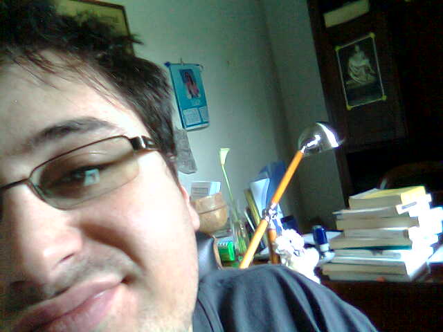 notate la grazia dell'espressione, il casino totale della stanza dietro di me (fiore stecchito da tre settimane nel vaso putrido, libri di ogni genere ovunque... se sarete buoni vi faccio anche un reportage sullo studio.