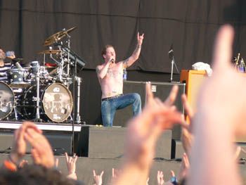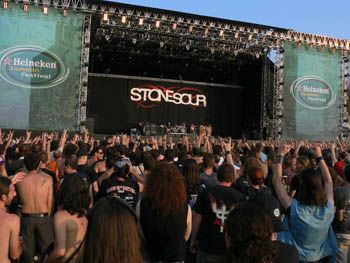 STONE SOUR APPENA GIUNTI DI FRONTE AL PALCO C’ERANO GIA’ GLI STONE SOUR ALL’OPERA CON UN SET PIUTTOSTO POTENTE DI SONGS TRATTE DAI LORO 2 ALBUM ALL’ATTIVO. GLI STONE SOUR NN SONO MALE, SI DISTINGUONO DAL NU, FANNO L’OCCHIOLINO AL METAL CLASSICO E AL ROCK SENZA SDEGNARE QUALCHE RICERCA DI NOVITA’...OTTIMA L’ESECUZIONE LIVE E ANCHE L’ADRENALINA NN E’ MALE! UN COREY TAYLOR, FRONTMAN ANCHE DEGLI SLIPKNOT DAVVERO IN FORMA CON MUSCOLI E TATUAGGI IN BELLA MOSTRA E CAPELLI CORTI CORTI DA MARINARETTO...ALTRO CHE NEL 2003 QUANDO SI PRESENTO’ CON PANCIONA DA BIRRA NASCOSTA DA UNA CAMICIOTTA DI FLANELLA E CAPELLI LUNGHI E ONTI!