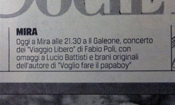 mercoledì 21 settembre 2011 - ore 19:07 Settembre Settembre è un mese che segna il tempo. La fine dellestate, linizio delle scuole, la ripresa del lavoro,insomma: il ritorno alla quotidianità. Con quel suo modo di fare dolce/amaro, tipo la pioggia col sole, tanto per capirci. E così, dopo mesi che cercavo di scrivere un testo su una linea melodica che avevo buttato giù a febbraio, e tutte le stronzate che ci avevo cantato sopra in inverno, ho capito che questa canzone in sol maggiore ma triste, era una canzone da "settembre". O adesso o mai più insomma. Sarei rimasto per leternità a cantare cose tipo " i wanna gana wanna gana" (che era il testo primordiale di "voglio fare il papaboy" prima di farmi venire quellidea) sotto lo sguardo perplesso dei miei amici. Come succede in questi casi, quando sento che potrei anche aver trovato lidea mi pongo sempre la classica domanda: cosa farebbe Mogol? Perchè Mogol, al contrario di quasi tutti gli altri, i suoi protagonisti li faceva muovere. Andare di qua, di là, cercare un parcheggio, prendere un treno, presentarsi davanti alla casa di una ex dopo un anno ....insomma nei testi di Mogol si cammina. Ed io volevo camminare. E così, mi sono un pò ispirato alla figura dellarlecchino in "amore caro, amore bello" attualizzando un pò la situazione, che tradotto in parole povere sarebbe "femmina che non ci casca". Infondo, molto probabilmente, questo decennio verrà ricordato per gli uomini "appannati" e quindi facciamoci sta foto... prima che arrivi ottobre, che poi "rien ne va plus" . SETTEMBRE (F.Poli) A settembre mi ritorni in mente e non so perchè te ne sei andata via e io non ti ho detto quasi niente e non so perchè ma non volevo più pensare... a te... A settembre tutto può accadere senza un perchè sento i passi sulle scale ma hai sempre voglia di cantare te?! Oh guarda il mondo comè piccolo comè sbadato come in fondo è pure un pò sbagliato E che a volte si scivola si cade da una nuvola si sbaglia donna e bar Ma tanto torno subito con una buona scusa che ti sorprenderà... Fine settembre piove quasi sempre chissà perchè.. ...va a finire proprio male a giocare col passato ...bevi un caffè ?! sai che vuoto che hai lasciato oggi è tutto un pò più caro ...ma saper vivere è "scontato"... Ah! E che a volte si scivola si crede ad una favola e ci si perde là Poi ci si sveglia tardi confondendo gli sguardi con linfelicità... Ma...è che a volte si scivola si cade da una nuvola sfiori leternità... Ma forse torni subito con una buona scusa magari basterà.... LEGGI I COMMENTI (1) - PERMALINK domenica 18 settembre 2011 - ore 19:31 Live bootleg Per tutti quelli che sono venuti a vedermi ai concerti di questa estate o per i curiosi o gli odiosi o i gelosi o i dignitosi o i rabbiosi, i mielosi, i pelosi, gli ampollosi, gli angolosi, gli antivaiolosi, ma pur sempre argillosi, i bollosi, bozzolosi,i brufolosi,i callosi,i caramellosi ma anche per i cavillosi, cellulosi, ciottolosi, collosi, dolosi, fallosi, favolosi, filosi , i fistolosi, flocculosi, freddolosi, frettolosi, globulosi, golosi, granellosi, granulosi,gli inesplosi, meticolosi, midollosi, miracolosi e anche per i morbillosi via, eccovi la versione live di VOGLIO FARE IL PAPABOY (cliccando sul link). Presa direttamente dal mixer (e per questo ringrazio il nostro fonico Claudio Gallo che mi ha recapitato il file), senza ritocchi, che satura in alcuni punti, come devono essere i bootleg, sporchi e obliqui, in questo caso vagamente beffardi, registrato il 3 settembre a Roncade (TV). In attesa dell’uscita di un mio nuovo singolo, dal sapore autunnale, tra pochi giorni... LEGGI I COMMENTI (2) - PERMALINK venerdì 9 settembre 2011 - ore 10:25 Evitando le buche più dure... 13 anni fa veniva a mancare Lucio Battisti. Ma in realtà non passa concerto in cui non lo veda ben presente negli occhi della gente. Giusto sabato scorso notavo tra il pubblico Harleysti tatuati di fianco a signore sulla sessantina in abito da sera, bambini che non arrivavano a 6 anni e perfino una discreta quantità di cinesi, tutti fomentatissimi. Tanto da subire, come ho già raccontato qua sotto, una gioiosa invasione di palco su SI, VIAGGIARE, perchè il legame è così forte che, quella volta nella vita, è giusto anche scavalcare transenne, security,tecnici e musicisti, fare cose che non penseresti mai, per andarsi a riprendere le proprie canzoni/emozioni lasciate chissà dove negli anni... Ecco io Battisti lo voglio ricordare così in quegli occhi lucidi... COMMENTA (0 commenti presenti) - PERMALINK domenica 4 settembre 2011 - ore 12:10 Live @ Roncade (TV) Cazzo che concerto ragazzi ieri sera!! Ma andiamo con ordine, perchè questa per me è stata una settimana piuttosto intensa. Lunedì omaggio a John Lennon nello splendido contesto dei giardini della rotonda in Piazza Mazzini a Padova. Da solo chitarra e voce, col repertorio Lennon/Beatles a disposizione. In pratica un triplo salto mortale carpiato con poca acqua nella piscina e i piranha pronti ad accogliermi! Dove ho proposto, tra le altre, una versione acoustic blues di COME TOGETHER che credo proprio di incidere nelle prossime settimane, perchè, per un colpo di culo, mentre cercavo una via interpretativa al pezzo, ho tirato fuori questo lato totalmente inesplorato del brano e poco conosciuto degli stessi Beatles. Serata bella piena di gente, rassegna fatta da Dio. Esperienza sicuramente da ripetere per gli amanti del genere.Nei giorni successivi ho potuto concentrarmi sul concerto di sabato a Roncade. Una cosa un pò particolare, a partire dalla location, una splendida cantina (per cui alcool a fiumi) con un grande giardino esterno dove per la prima volta si proponeva un concerto di queste dimensioni, passando poi per l’organizzazione di una esclusiva festa privata con tanto di fuochi d’artificio su IL TEMPO DI MORIRE e finendo con la richiesta perentoria di mettere in scaletta VOGLIO FARE IL PAPABOY (che poi per acclamazione popolare è sta