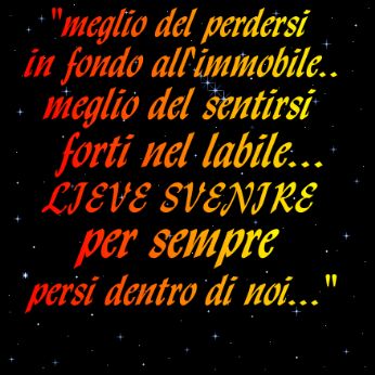 mercoledì 26 agosto 2009 - ore 12:38 riguardavo un blog stamattina..e m’è venuta immediatamente voglia di tornare a scrivere nel blog.. ahhhh beati poteri sovrannaturali... giusto per dire due cazzate..tornato alla vita Padovana da troppo poco tempo per non sentire ancora alle spalle il rumore di casa..le melodie del mare..e gli urti di tutte queste infinite serate passate fra locali,spiagge..posti da incanto e sbornie varie ed eventuali.. .. se mai pubblicherò qui delle foto in attesa che facebook mi dia una valida motivazione per la quale mi ha disattivato l’account...tornerò a farmi un po’ di male.. e a far ripartire un conto alla rovescia..stavolta lungo un bel pò. ![]() Ale COMMENTA (0 commenti presenti) - PERMALINK giovedì 9 luglio 2009 - ore 21:49 THANK YOU Mr. BONO...THANK YOU. ![]() ![]() ![]() COMMENTA (0 commenti presenti) - PERMALINK giovedì 7 maggio 2009 - ore 01:05 "e allora come spieghi questa maledetta nostalgia..." COMMENTA (0 commenti presenti) - PERMALINK domenica 5 aprile 2009 - ore 23:40 forse a volte lo è in se ,in ogni situazione....brutta,dolorosa che sia... il mio è un male strano che credo spesso riesca persino a tramutarsi in percezione fisica. Però sorrido,guardo avanti e tramuto tutto in marmo. E’ l’ora di farlo..è l’ora di sentirsi se stessi. Me stesso è scrivere dei messaggi,me stesso è non aver rimorsi..e io ora non ne ho. Dispiace..perchè quel video "seduta,zampa,bacio"prima d’un biscotto, nel buio di una splendida serata d’estate è ancora lì e da lì non si muoverà. Lo sento ancora sulla mia pelle,perfino l’odore,l’amore,il sentimento. Sincero,come sempre. Dolce notte a te che stasera chissà dove sarai,che stasera probabilmente non penserai affatto a me...come del resto chissà da quanto.. dolce notte a me...che nei pesieri trovo riparo ogni notte. perchè sia quello che volevi.. LEGGI I COMMENTI (2) - PERMALINK venerdì 20 marzo 2009 - ore 00:00 a te che in silenzio sei sempre stato la parte piu’ bella e sincera della mia vita..a te che,di te mi hai fatto prendere la parte migliore..un pensiero a te che non vai mai fuori dalle righe...che uno sguardo vale piu di milioni di parole...che non sai dire di no...che sei sempre disponibile in ogni momento..a te che non mi hai MAI fatto mancare nulla,nonostante tutto,nonostante i miei continui errori e le mie cazzate... a te che ancora oggi piangi ti commuovi e scappi per non farti vedere e sentire,quando senti la distanza..la lontananza.. a te.. che sei la mia fortuna piu grande.. un amico prima di un papà... ... TANTI AUGURI.. tvb COMMENTA (0 commenti presenti) - PERMALINK martedì 17 marzo 2009 - ore 15:15 LEGGI I COMMENTI (2) - PERMALINK venerdì 13 marzo 2009 - ore 19:19 TicketOne di merda! LEGGI I COMMENTI (2) - PERMALINK martedì 10 marzo 2009 - ore 22:11 Ho scoperto che mi mancano troppe cose. Sento la mancanza. Di alcune è una sensazione strana,perchè non mi mancano in sè,ma mi manca innervosirmi incazzarmi avere qualcosa di cui discutere....mi mancano alcuni sguardi ,che ormai da un pò ho sotterrato sotto quintali di GIUSTO orgoglio,di giustissimo orgoglio. E’ il bisogno di farmi male,lo so...non sarei io altrimenti. Vedo sempre del buono,ovunque...vedo speranze dove forse non dovrei..dove forse sarebbe inutile persino provarci. Ma leggere il "nome" qualcosa mi smuove. Me lo faccio passare,su questo non ci piove. Go Ale Go Non sprecherò piu di 2 frasi per dire che ci son "cose"che mi mancano,punto!Che non c’è paragaone con niente e nessuno,perchè son cose che smuovono l’intero ME. UN GIORNO MI RIPRENDERò TUTTO. L’ansia non mi abbandonerà fino a venerdi pomeriggio.finche’ non stringerò fra le mani un biglietto che vale MOOOOOOOOOOOLTO più d un concerto...molto piu dei 60 euro che spenderò sorridendo. Ho le mani in pasta ovunque per riuscire a comprarlo..ma so già che finirò per passare un giovedì notte seduto davanti TicketOne...per una sera d’estate da raccontare a vita questo e altro!! IO CI SARò. Ora torno a smaltire un pò di nervoso...a rilassarmi sul divano in camera lontano da provocazioni e occhi indiscreti...domani sarà un altro giorno,e un altro in meno da quello da ricordare! Notte COMMENTA (0 commenti presenti) - PERMALINK lunedì 2 marzo 2009 - ore 00:26 andrò a letto provando a convincermi che in fondo non è colpa mia..che i pensieri m’assalgono perchè ci sono...son lì...dietro ad ogni foto,dietro ad ogni nota. E’ l’urlo che mi tengo dentro ad accompagnarmi in questi secondi..perchè...perchè so che non ho scelta se non quella di star buono,provando a farmi scivolare addosso la vita...quella che magari non è la vita che continuo a sognare..quella che se chiudessi gli occhi direi senz’altro " è solo questo che voglio,nient’altro",ma è quella che ho...lontana km da una certezza,che è mia...e mia resterà. Son stupidi pensieri forse di una mente contorta,forse son pensieri di un ragazzo che a 25anni crede in ciò che lo renderebbe felice,in ogni singolo battito in più se l’argomento è quello lì... non ho vergogna di me...non ne ho mai avuta per quello che sono,nè paura di pensieri altrui.. a volte ho solo paura di un pensiero...che mi svuota...allo stesso modo in cui mi riempie... Dolce notte,a te.. a me che chiuderò gli occhi sorridendo... pensando che non c’è distanza che tenga quando tra pochi attimi sognerò... "Where I grew up there were no hills at all The land was flat, the highway straight and wide My brother and I, we’d drive for hours, like we’d years instead of days Our faces as pale as the dirty snow Once I knew there was a love divine Then came a time I thought it knew me not Who can forgive forgiveness when forgiveness is not? Only the land as white as snow And the water it was icy As it washed over me And the moon shined above me Now this dry ground it bears no fruit at all Only [..] under a crescent moon The road refuses strangers The land, the seeds we sew Where might we fi