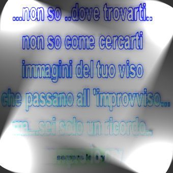 giovedì 8 febbraio 2007 - ore 22:12 ....dolce notte a tutti...un bacio.... COMMENTA (0 commenti presenti) - PERMALINK giovedì 8 febbraio 2007 - ore 21:11 cambiamenti... ...oggi ho fatto shopping... e credo che già stasera inizierò..668 pagine...che divorerò sicuramente... sto diventando veramente intollerante...e ogni giorno che passa è sempre peggio...mentre prima avevo molta pazienza ora scatto per niente...e non è una bellissima cosa... me ne rendo conto al lavoro, ma non solo...mi rendo conto che non sopporto più tante persone che mi stanno intorno, non riesco a sopportare certi comportamenti, certi modi di fare... sarà il periodo...o più semplicemente sarà che mi son stufata di essere sempre la persona buona, paziente e disponibile...da oggi si cambia...deciso...una buona volta devo fare qualcosa per me, indipendentemente da quello che ogni altra persona può pensare...indipendentemente da tutto...basta al perbenismo, basta al sorriso per chiunque...devo fare così per stare meglio io...lenergia che ho è solo mia...e solo per me... ...ma perchè ho tutti sti pensieri? perchè??? COMMENTA (0 commenti presenti) - PERMALINK mercoledì 7 febbraio 2007 - ore 19:16 ...e non spiego il motivo di questo post...è solo una cosa mia... COMMENTA (0 commenti presenti) - PERMALINK martedì 6 febbraio 2007 - ore 22:17 per vedere ciò che non vedi. Lenergia, lallegria, per strapparti ancora sorrisi. Dirti sì, sempre sì, e riuscire a farti volare, dove vuoi, dove sai, senza più quel peso sul cuore. Nasconderti le nuvole e quellinverno che ti fa male. Curarti le ferite e poi, qualche dente in più per mangiare. E poi vederti ridere, e poi vederti correre ancora. Dimentica, cè chi dimentica distrattamente un fiore una domenica e poi... silenzi. E poi... silenzi. Silenzi... Nei giardini che nessuno sa si respira linutilità, cè rispetto e grande pulizia, è quasi follia. Non sai come è bello stringerti, ritrovarsi qui a difenderti, e vestirti e pettinarti sì, e sussurrarti non arrenderti. Nei giardini che nessuno sa, quanta vita si trascina qua, solo acciacchi, piccole anemie. Siamo niente senza fantasie. ![]() LEGGI I COMMENTI (4) - PERMALINK lunedì 5 febbraio 2007 - ore 21:58 che stress... -odio il lunedì e questo è un dato di fatto... -odio i primi 15 giorni del mese e questo è un altro dato di fatto... -odio aver mal di denti...andare il lunedì sera dal dentista e dover ricominciare a prendere gli antibiotici che mi scombussolano tutto l’organismo...e aspettare un’altra settimana per vedere cos’ho su sto dente... a questo aggiungiamo che sono un pò scazzata per un’altra cosa...ma insomma...uff...che stufa di cose complicate...e nonostante il mio saggio nipotino mi dica esattamente queste cose... schumacher nn è diventato quello che è stato dopo 2 giorni di guida... neanche pelè dopo 2 giorni di calcio e nemmeno hendrix dopo 2 gg di chitarra... io ho bisogno di stare bene...!!! per fortuna cmq ogni tanto qualcosa di positivo c’è...forse vado a vedere un concerto a cui tengo molto...nonostante mi ricordi qualcuno...e anche tanto... poi...sì, un’altra bella cosa...se ce la faccio per fine mese vado a Milano a fare un weekend...ma per scaramanzia non voglio dire nulla...anche se stavolta NON centrano programmi televisivi!!!...però se ci sarà la possibilità di farlo...so che sarà un weekend bellissimo...lo so a priori...!!! ora, alla faccia del mio dentista e della dieta, mangio le fragole con la panna montata...sì sì... COMMENTA (0 commenti presenti) - PERMALINK domenica 4 febbraio 2007 - ore 21:45 COMMENTA (0 commenti presenti) - PERMALINK domenica 4 febbraio 2007 - ore 11:32 Buongiorno!!! mi sono appena svegliata...come al solito dovevo fare dei giri stamattina...ma il sonno...eh...il sonno vince sempre!!! stavo pensando ad un paio di cose.... 1)oggi stranamente...diciamolo piano...niente nebbia...yeah!riesco a vedere la casa difronte alla mia...ieri non si vedeva!!!in compenso c’è un vento fuori...ma meglio così, chissà porti via tutta sta umidità... 2)mi stupisco delle emozioni che provo in certi momenti...io lo so che tanto normale non sono...ma è bello emozionarsi per una canzone, per ricevere un messaggio, per vedere che qualcuno a suo modo mi pensa...forse sbaglio...ma...beh, lasciamo stare...cmq mi emoziono... 3)ieri sera divertita proprio tanto...come al solito quando si è in poche persone e non si dice "stasera devo divertirmi" ne esce una bella serata...per carità, non è successo nulla di diverso dal solito...aperitivo, pizza, cinema e poi ancora Cortes...tanto per cambiare...ma bello!!!e cmq vi consiglio di andare a vedere "Step Up"....porca paletta...quel ballerino...un fisico...una bocca...ehm...io son fissata per le labbra degli uomini....beh, merita di essere visto!!! 4)alla luce del punto 3)...mi chiedo...ma tante persone che conosco...ci fanno o ci sono così?! mi rendo sempre più conto che ci son persone cattive dentro, invidiose e davvero egoiste (non come me, che non lo sono....ma che anzi dovrei forse un pò imparare ad esserlo)...io non so cosa può portare questa cattiveria gratuita, questo approffittarsi delle persone...proprio non lo so. Ci pensavo stanotte prima di dormire...per carità, anche a me è capitato di dire battute pesanti su certe persone, anche a me, magari ferita per dei comportamenti, delle cose, è venuto spontaneo dire delle cattiverie, ma solo mossa dal momento...a mente fredda poi mi sarei morsa la lingua invece di parlare.... ma altre persone no...continuano a comportarsi in modo squallido e meschino...e se con me non hanno rapporti lo fanno con le altre persone che cmq mi circondano...e ciò mi fa davvero molto molto incazzare. Io penso che mai nessuno, o forse al massimo una persona o due, mi ha vista davvero incazzata...avviso...divento davvero cattiva...e quindi...se ste cose continuano, se continuo a sentir dire in giro certe cose, se continuo a vedere dei comportamenti che mi danno fastidio.