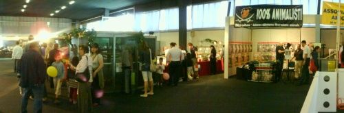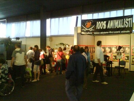 (Stand dell’Associazione "100% ANIMALISTI" ad 1 metro dagli ANIMALI IN GABBIA)
