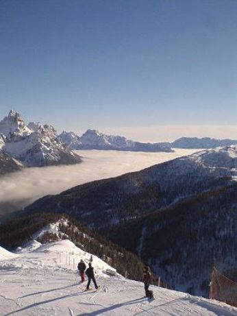 E oggi a San Martino di Castrozza!! Per un’intensa giornata di sci!! E lassù sul cucuzzolo c’era il sole splendenteee!! E una foto lo può confermare!!! Al centro della foto si nota una coltre di nuvole.. a valle il tempo faceva schifo!! Mi son pure abbronzata la punta del naso!!