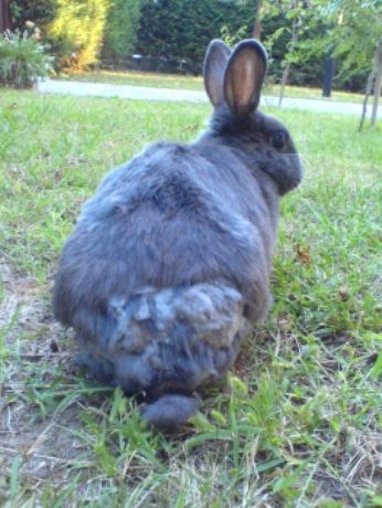 La parte del pelo corto, mezzo grigio chiaro e mezzo grigio scuro, esattamente un mese fa era tutto carne viva. Comprese zampe posteriori, coda e parte di pancia che non si vedono dalla foto. Stava per essere divorata da larve di mosca che hanno deciso di deporre nel pelo della mia amata coniglia. E non pensiate fosse sporca. Ogni giorno è pulita e super seguita..