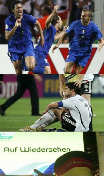 ![]() Take the time to make some sense Of what you want to say And cast your words away upon the waves Sail them home with acquiesce On a ship of hope today And as they land upon the shore Tell them not to fear no more Say it loud and sing it proud Today... And then dance if you want to dance Please brother take a chance You know they’re gonna go Which way they wanna go All we know is that we don’t know -- How it’s gonna be Please brother let it be Life on the other hand won’t let us understand We’re all part of the masterplan Say it loud and sing it proud Today... I’m not saying right is wrong It’s up to us to make The best of all the things that come our way Coz everything that’s been has past The answer’s in the looking glass There’s four and twenty million doors On life’s endless corridor Say it loud and sing it proud And they... Will dance if they want to dance Please brother take a chance You know they’re gonna go Which way they wanna go All we know is that we don’t know -- How it’s gonna be Please brother let it be Life on the other hand won’t let you understand Why we’re all part of the masterplan martedì 11 luglio 2006 - ore 15:15 Sinead O Sin End? Bene. Speso soldi anche ieri dal gommista. Adesso, toccandolo il ferro invece di passarci sopra con la macchina, ci dovremmo vedere tra 15.000-20.000 chilometri. Sinead O’Connor allo Sherwood, arriviamo belli nutriti dalla sagra a Campodoro e visto che questo è anche un blog gastronomico, consiglio il sugo alla boscaiola come primo e sconsiglio vivamente le salsicce, a meno chè non prendiate almeno un litro di rabosello (questo è consigliato) per alterare un po’ i gusti in bocca... Una cantautrice irlandese rasata e gravida, di una tunica arancio-hare krishna vestita, per buona parte del concerto anche in crisi d’aria a giudicare dalla voce... altra vittima dell’umidità dela nostra pianura Padana? ![]() Sembra timida, dedica una canzone alla luna piena, un’altra per i Mondiali vinti... Solo alla fine viene fuori la grinta che mi aspettavo già dall’inizio, urla, potente... tutti si scuotono... Il finale è stato vivace. Ma solo quello purtroppo. Mi aspettavo che bruciasse almeno una foto con Reitzinger. Birra per riprendersi, dietro di me il mitico Bac, mitico prof di disegno tecnico del Severi, alle prese con delle cartine ![]() Tampax ha preso un poster col faccione di Sinead... forse lo vuole portare a messa e bruciarlo davanti ai credenti. Il ritorno verso casa è allietato da una scelta impeccabile del random dell’autoradio, i Timoria stranamente... Oggi finalmente qualcuna ha finito questi esami, un po’ di tempo libero in più e vacanze... Stasera, in preda all’entusiasmo da Mondiale, calcetto, la convocazione è arrivata, vediamo se arrivo io alla fine del match. E vediamo anche se arriva la convocazione da uno che dovrebbe essersi fatto una ceretta per una jam... senza holograms. Sempre se è sopravvissuto alla ceretta integrale sul petto. "Tears From The Moon - Sinead O’Connor" LEGGI I COMMENTI (15) - PERMALINK lunedì 10 luglio 2006 - ore 13:38 ...Of The World!!! "Dietro ogni scemo, cè sempre un villaggio" Zidane è lo scemo e la Francia è il villaggio. E correva voce che sua madre fosse in vetrina a Rotterdam e che fosse diciamo... un po disinibita e disponibile. Una carriera invidiabile conclusasi con linfamia... ![]() Pagherei oro per sapere cosa Materazzi gli ha detto... Tutti pazzi per Materazzi!!! Ma anche no. Questo per dire che siamo CAMPIONI DEL MONDOOOO!!! E con questo ho visto 2 mondiali vinti dallItalia. Però questo lho goduto decisamente di più... Grazie ragazzi... Grazie Ivan Gennaro, mio idolo indiscusso, di ieri, di oggi e di domani... ![]() Grazie al tricolore, quello col verde al posto del blu... Grazie amici, soprannominati i magnifici 7 viste le ultime due partite, ognuno con le sue bestemmie, ognuno con i suoi rituali, qualcuno coraggioso e qualcuno meno durante i rigori ma tutti uniti fino alla fine... ![]() Grazie a chi ha messo la casa, a chi ha messo la birra, i dolci o le patatine, le viennette o i cagnoni da coccolare... Grazie al cavalier Ciscato che ha fornito le due birrone scaramantiche da 12° ... Grazie a Goffredo Mameli. Grazie a Nesti e Mazzola, anche se non dovrebbe bere grappa durante le dirette... Grazie a Caressa e Bergomi... Grazie al Prato... Grazie ai caroselli... Grazie alla pizza... Grazie alla Chiabotto... Grazie alla Vallespluga... Grazie al signor MediaWorld... Grazie a Noel Gallagher e alle sue mutande onte portafortuna... Grazie ai White Stripes per Seven Nation Army... Grazie a Jena, C2KL e Pornopilots per aver allietato il pomeriggio pre finale... Grazie a chi si farà delle super cerette dolorose come pegno per questa vittoria... Grazie al mio capo francese che ha deciso di venire comunque... Grazie al chiodo impiantato nel pneumatico e alla fattura che mi farà il gommista stasera... Come direbbe Meda in questi casi... Chapeaux! ![]() Siamo i CAMPIONI DEL MONDO!! "We Are The Champions - Queen" LEGGI I COMMENTI (16) - PERMALINK sabato 8 luglio 2006 - ore 16:34 Dirty Pretty Bootleg Emule mi ha trovato questa canzone: "Dirty pretty things - Live at Dna - 10 - Boys in the band" Sto cercando di riconoscere qualche voce conosciuta in sottofondo... "Boys In The Band - The Libertines" LEGGI I COMMENTI (9) - PERMALINK sabato 8 luglio 2006 - ore 15:51 Noel For Azzurri Ci sono alcune “incombenze” di cui farei a meno… e spesso ci riesco, non solo per merito mio… Mi spiace per quelli a cui toccano in mia vece... Dipende dalla “sensibilità” della gente con cui abbiamo a che fare. Avete, abbiamo, tutta la mia solidarietà. Tutto si fa volentieri… ma fino ad un certo punto… Ah...ma...siete stati anche voi in ferie a Barcellona? ![]() Bravi Innuendo ad Arre, ormai è diventato appuntamento tradizionale… Patatini… falsetto docet. Non si sono visti scendere lacrimosi… ![]() Missione regalo compiuta. Basta ess