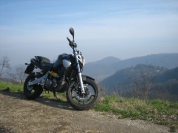 Ieri mattina sveglia alle 10. Mezzora di rulli. Doccia. Colazione (che era ormai un pranzo). Il sole si fa vedere tra le nuvole. Tre ore in moto nei colli, bellissimo. (nella foto: il mostriciattolo sulla strada che porta al monte madonna) Giretto all’emmezeta per il router wireless. I carabinieri mi chiedono i documenti, ma è solo perchè avevano fatto una scommessa su che modello fosse la mia moto.. nessuno dei due ha vinto. Pizza all’HK alle sette e mezza, senza pranzo la fame si è fatta sentire molto in anticipo. A casa ad installare il router, che funziona ma che non mi connette ad internet il modem adsl alice.. boh, stasera riproverò..