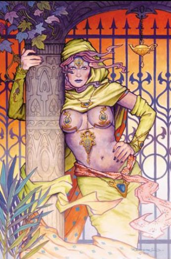 ...a sinistra una fila di torri multicolori, alte e delicate, eppure massicce, sormontate da aggraziate spirali. La più vicina era fatta di un materiale azzurro, una qualche pietra che brillava alla luce con lo stesso fulgore dei lapislazzuli; altre ancora erano dorate, color fiamma, viola.