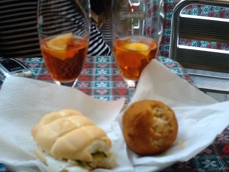 Per concludere in bellezza, ecco il nostro pranzo (o quello che siamo riuscite a fotografare, visto che ci siamo strafogate): arancini di riso, paninetto con le zucchine e la mozzarella, spunciottini con crocchette di patate e mozzarella in carrozza con prosciutto...tutto alla modica cifra di 7,50€...grazie al mio amore che mi ha portato ancora al primo appuntamento in questo magnifico angolino "d’osteria"