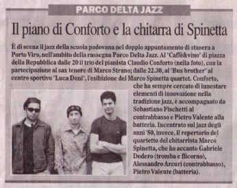 Ecco il link al mio sito personale: www.pietrovalente.com Il mio canale Youtube sabato 30 settembre 2006 - ore 13:36 Stupendo Ieri mi sono fatto una bellissima suonata con Leonardo Rigo, Matteo Alfonso e Alberto Vianello, loro sono ottimi musicisti, il locale era un jazzclub in centro a Venezia, molto carino e con un bel pubblico attento e partecipe che abbiamo conquistato pienamente. Veramente gran bella serata e stasera si fa il bis! COMMENTA (0 commenti presenti) - PERMALINK giovedì 28 settembre 2006 - ore 14:46 Due date a Venezia Mi ha contattato Leonardo Rigo, un bravissimo contrabassista per suonare a Venezia domani e sabato, ha detto che è una bella situazione anche se non so di preciso dove suoneremo. Era da un po’ di tempo che volevo suonare con lui e dal nulla mi ha contattato...che piacevole coincidenza. Vi farò sapere come va. P.S. il mio sito procede, ho aggiunto la pagina dei links. COMMENTA (0 commenti presenti) - PERMALINK martedì 26 settembre 2006 - ore 13:18 www.pietrovalente.com Il mio sito procede...lentamente sto riempiendo le pagine. Non è semplice perchè si incontrano sempre ostacoli inaspettati mentre si aggiungono informazioni. Per alcune pagine dovrò aspettare laiuto di Blues Baby perchè la mia capacità di manovra con Dreamweaver(il programma che uso per fare il sito) è limitata. Comunque le pagine più importanti sono già on-line. Se vi va di darci unocchiata sarei felice di sentire pareri e consigli. www.pietrovalente.com LEGGI I COMMENTI (1) - PERMALINK giovedì 21 settembre 2006 - ore 11:15 Sta per arrivare Il mio sito è quasi ultimato, secondo le stime della mia webmaster qui presente: miss. blues baby ce la dovremmo fare entro la mattinata...vedremo... .Attualmente al mio indirizzo www.pietrovalente.com cè un bel UNDER CONSTRUCTION...non per molto...spero... dunque al lavoro! LEGGI I COMMENTI (5) - PERMALINK mercoledì 13 settembre 2006 - ore 11:04 Pego si sposa! Incredibile, venerdì Pego si sposa. Ci conosciamo da 10 anni e sinceramente mi fa strano! Venerdì suoneremo al suo matrimonio con i Kids e poi da quello che ho capito scatta la jam(su questo punto linteressato può confermare o smentire). Ci divertiremo come pazzi me lo vedo! LEGGI I COMMENTI (2) - PERMALINK giovedì 7 settembre 2006 - ore 14:12 Delay Dopo la splendida serata di domenica alla Casa gialla ho due belle novità e una brutta...quale volete per prima ...ok, le belle: mi ha contattato un gruppo vocale già avviato con due repertori, uno gospel e uno R&B, sembra molto interessante, vedremo come va; laltra bella è che il mese prossimo ho due date al Q, una con il trio e una con Marco Strano; la brutta è che lesame finale allUM me lhanno spostato ancora, lo farò i primi di novembre, ovviamente la data me la diranno 2-3 settimane prima...che strazio! COMMENTA (0 commenti presenti) - PERMALINK giovedì 31 agosto 2006 - ore 17:34 Il giorno della prima Ok, mi rendo conto che quello che sto per scrivere non ha nessuna rilevanza sullequilibrio planetario però per me è molto importante quindi ve lo dico: domenica alla Casa Gialla in occasione del concerto con il mio trio, per la prima volta nella mia vita, verrà eseguito in pubblico un brano interamente composto e arrangiato da me. vediamo che succederà...ah ovviamente allingresso del locale verrete perquisiti da me stesso per evitare che vengano introdotte allinterno verdura, uova marce e quantaltro possa deturpare il palco e lo spettacolo COMMENTA (0 commenti presenti) - PERMALINK mercoledì 23 agosto 2006 - ore 14:46 Aggiornamento Ho aggiunto al calendario la prima data di settembre, visto che questo è il progetto a cui tengo di più e adesso è anche a mio nome, mi piacerebbe molto che le persone che mi conoscono in questo sito vengano al concerto. In particolare gente come: valeta, sisso, deadinside non possono mancare e altri come: pego, lsdn, simasia, patitucci sono tenuti a presentarsi il 3 settembre alla Casa Gialla visto che non sono mai venuti a vedermi con il trio! ![]() Qui trovate la cartina per andare alla Casa Gialla via Rialto 4 Rovolon (PD) Quindi non ci sono scuse! LEGGI I COMMENTI (1) - PERMALINK venerdì 11 agosto 2006 - ore 12:59 Doppia data Ieri sera ho suonato con due gruppi diversi, quasi 4 ore di jazz, per un momento mi sembrava di essere tornato a Siena. C’erano diversi nostri amici musicisti, le notizie delle mie imprese in terra "straniera" erano già arrivate. Un’altra cosa bella e piuttosto insolita che ho potuto constatare è che in questo concerto mi sono accorto con stupore di essere migliorato moltissimo rispetto a 2 settimane fa, voi direte è ovvio, si è vero ma è anomalo accorgersene e rimanerne impressionati, è una strana sensazione. Per quanto riguarda i concerti sono andati molto bene entrambi soprattutto sul piano dell’energia, c’era una bella atmosfera musicale ed anche il pubblico ha contribuito a crearla. Allego l’articolo di giornale che uscito sui concerti. Hanno messo la foto dei "carcerati"...dobbiamo assolutamente correre ai ripari da quel punto di vista. LEGGI I COMMENTI (2) - PERMALINK martedì 8 agosto 2006 - ore 18:44 Eccomi qua Sono appena tornato dai seminari di Siena jazz...come dire...mi faccio fastidio da solo...non ci credo ancora ma è la verità: ho vinto ancora! Unico batterista ad essere premiato con la borsa di studio per tornare lanno prossimo per ledizione speciale del trentennale, tutto spesato...incredibile...e non è tutto. Ora devo andare perchè ho un mucchio di cose da fare, domani vi racconto. LEGGI I COMMENTI (11) - PERMALINK > > > MESSAGGI PRECEDENTI |