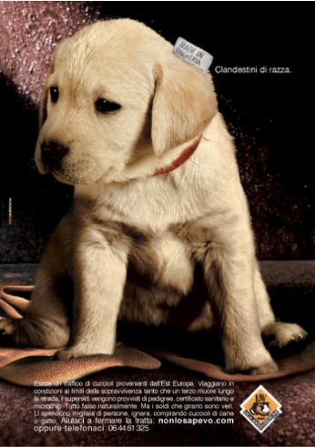 Campagna Lav 2009... Per Pasqua prendete luovo negli appositi banchetti che troverete nelle piazze delle vostre città... Il ricavato servirà a contrastare il traffico illegale di cuccioli... Ogni anno ne muoino centinaia come questo della foto, che poi magare finisce nei profili delle vostre giacche, dopo essere stato squartato...