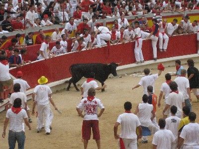 allora partenza da barcellona lunedì notte..direzione pamplona partenza alle 23.00 5-6 ore di viaggio arrivo a Pamplona alle 5.30 del mattino, nessuna pronotazione fatta in precednza, uno zainetto con effetti personali un asciugamano 0 ricambi e una tenda.....il tempo di capire dove siamo e ci rendiamo conto che la festa della sera precedente non era ancora finita....alle 5.30 i bar erano aperti i chioschi dei panini e stuzzichini vari tutti aperti c’era gente che vomitava e ballava, beveva e rideva musica alta e una città piena di giovani...noi storditi dal sonno faciamo un giro a vuoto per conoscere il territorio...alle 6,30 vediamo che alcune persone si accingevano a collocare le staccionate per la corsa e noi subito a pensare cazzo così presto lavorano, se la corsa è il pomeriggio ...ed è qua che sbagliavamo la corsa è alle 8.00 del mattino...quindi eravamo già in ritardo per trovare dei posti liberi in prima fila,,,ma alla fine alle 8.00 precisi la coesa è iniziata e il resto già lo sapete....entusiasmante!!