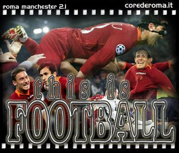 .......IERI SERA LA ROMA HA DATO DIMOSTRAZIONE CHE MERITA DI STARE GIUSTAMENTE ALMENO FRA LE OTTO GRANDI DEL CALCIO EUROPEO UNA GARA FANTASTICA MACCHIATA SOLAMENTE DA QUEL GOL REGALATO A ROONEY,MA ALLA FINE VA BENE COSIABBIAMO DATO SECONDO ME UNA LEZIONE DI CALCIO.........LEMOZIONE PIU BELLA COME AL SOLITO E STATO IL GRANDE PUBBLICO DELLA NOSTRA SQUADRA,SENTIRE CANTARE LINNO DELLLA ROMA A SQUARCIA GOLA DA TUTTO LO STADIO MI HA DATO UNA BOTTA TREMENDA AL CUORE,ERA COME VIVERE IN UN SOGNA E MI SEMBRAVA DI ESSRE LI IN CURVA COME 12 ANNI FA A CANTARE PER LA MAGICA..........