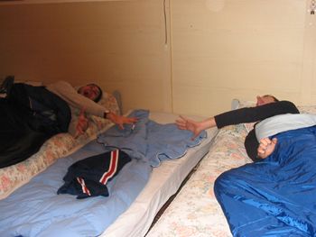 Nel frattempo si attende l’arrivo dell’immancabile Krasto, previsto per le ore 01:30 ma che, tra un intoppo e l’altro, avverrà solo a notte inoltrata. Dilo e il Cla, distrutti, si fiondano nel sacco a pelo, mentre i restanti 3 vanno ad accogliere Big K e il fido Citterio nel remoto (e sconosciuto perfino alle mappe) paese di Bosisio Parini. In ritardo clamoroso, verso le 6 del mattino, il gruppo è finalmente riunito, giusto in tempo per qualche cazzata e per fiondarsi nei sacchi a pelo dopo essersi sorbiti 8 ore di freddo glaciale. Si risveglieranno i Nostri o faranno la fine di Oetzi, la mummia delle alpi? Il Cla e il Manzo se lo domandano in questa foto: