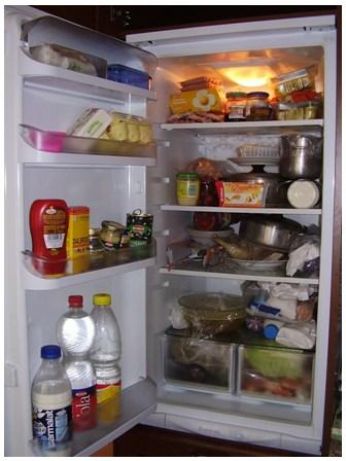 Così, il frigo che mi si presenta la domenica mattina, quando la mia unica preoccupazione è prendere il latte per mangiarmi i biscotti, è questo.
