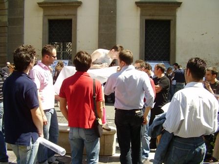 Io sono quella che si offre di pensare al papiro, perchè mi piace come occupazione. Trovo una copisteria che mi fa anche lo sconto perchè ho gli occhioni belli. Lascio lì il foglio e mi dicono torna tra mezz’ora. Vado a bermi un caffè in centro, con lingenuità di un marmocchio con gli occhiali spessi.