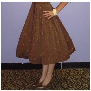 L’effetto è vagamente simile a questo qui sotto. Ma dovete immaginare una gonna più bella, molto più bella, centomila volte più bella. A sagome di grandi fiori bianchi su fondo marrone terra di siena bruciata. Divina.