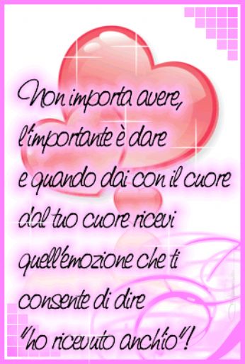 martedì 29 aprile 2008 - ore 00:50 Sempre... Non chiedetemi di sorridere Non chiedetemi di essere felice Perchè ora non sò più cosa vuol dire essere felici. ![]() Continua questo dolore tremendo... ![]() ![]() Da impazzireee!!! LEGGI I COMMENTI (3) - PERMALINK martedì 29 aprile 2008 - ore 00:06 Quinto test dal Blog di Anamaya HAI MAI O SEI MAI... - Fumato una sigaretta: SI - Vomitato dopo essere totalmente ubriaco: SI - Fatto un incidente con la macchina di un amico: NO - Rubato una macchina: NO - Essere stato innamorato: SI - Essere stato lasciato: SI - Rubato qualcosa: SI - Essere stato licenziato: NO - Lasciato il lavoro: SI - Essere stato coinvolto in una rissa: NO - Uscito di nascosto da casa: NO - Provato qualcosa per qualcuno che non ricambiava: FORSE - Stato arrestato: NO - Stato ad un appuntamento al buio: SI - Aver mentito ad un amico: PIù O MENO - Saltato la scuola: NO - Visto qualcuno morire: SI - Stato in America: NO - Stato in Germania: SI - Stato su un aereo: SI - Stato dall’altra parte del mondo: NO - Andato a Parigi: NO - Nuotato nell’oceano: NO - Pianto fino ad addormentarsi: SI - Giocato a guardie e ladri: SI - Colorato coi pastelli: SI - Cantato al karaoke: NO - Pagato una cena solo con monetine: NO - Fatto qualcosa che ti eri detto non avresti fatto: SI - Fatto scherzi telefonici: NO - Riso così tanto da farti uscire dal naso quello che stavi bevendo o mangiando: SI - Preso un fiocco di neve con la lingua: NO - Danzato sotto la pioggia: NO - Scritto una lettera a Babbo Natale: SI - Stato baciato sotto le dita dei piedi: SI - Visto l’alba con qualcuno a cui vuoi/volevi bene: NO - Fatto le bolle di sapone: SI - Fatto un fuoco sulla spiaggia: NO - Andato sui roller-blade: NO - Pattinato sul ghiaccio: SI - Rubato un cartello stradale: NO - Coinvolto in un incidente d’auto: SI - Fatto l’amore su una spiaggia: NO - Baciato il ragazzo di un altra: SI - Attratta da un amico: NO - Abbracciato un albero: NO - Guidato una Ferrari: NO - Detto ti amo credendoci: SI - Fatto il bagno nudo nel mare: NO - Dormito sotto le stelle: NO - Parlato con accento straniero per un giorno intero: NO - Vinto a qualche lotteria: NO - Munto una mucca: SI - Stato in giappone: NO - Sistemato i cd in ordine alfabetico: SI - Sognato di essere un supereroe da fumetto: NO - Baciato sotto la pioggia: NO - Stato baciato appassionatamente da provare le vertigini: SI - Fatto sesso in ascensore: NO - Cucinato biscotti: SI - Masturbato in luogo pubblico: NO - Avuto paura di morire: SI - Letto omero: NO - Barato al gioco: NO - Pianto per un giorno intero: SI - Rubato le saponette in un albergo: SI - Stato in vacanza con il mio ragazzo: SI - Ripensato a un ex: SI - Fatto esercizi tantrici: NO - Stato legato: NO - Fatto un video hard: SI - Giocato a briscola: SI - Fatto sesso al cinema: NO - Stato in un sexy shop: SI - Fatto murales: NO - Ho origliato a una porta: NO - Fatto di tutto per rendere felice una persona: SEMPRE - Stato a una festa della birra: SI - Fatto giochi alcolici: NO - Stato tradito: PENSO DI NO - Avuto incubi ricorrenti: NO - Avuto una ’storiella’ da vacanza: NO - Scritto ti amo sulla spiaggia: NO COMMENTA (0 commenti presenti) - PERMALINK sabato 26 aprile 2008 - ore 18:38 Significati... ![]() ![]() E dura ma spero il tempo rimargini tutto... LEGGI I COMMENTI (3) - PERMALINK giovedì 24 aprile 2008 - ore 11:50 Pensavo... ![]() Ed invece eccomi quì ancora una volta a star male... ![]() Nuovamente triste e sola... ![]() Nuovamente a leccarmi le ferite per un’idiota che forse non mi ha mai meritato... ![]() Ma che ho fatto di male per vivere così infelice??? ![]() In fondo chiedo solo di essere un pò felice e di donare amore... tutto quell’amore che mi è sempre mancato e che sento di poter donare... racchiuso dentro al mio cuore... ![]() L’unica cosa che mi sento di dire ora è: N G P LEGGI I COMMENTI (4) - PERMALINK sabato 19 aprile 2008 - ore 01:29 Lamore... Lamore è sempre paziente e gentile. Non è mai geloso. Lamore non è mai presuntuoso e pieno di sè. Non è mai scortese o egoista. Non si offende e non porta rancore. Lamore non prova soddisfazione per i peccati degli altri. Ma si delizia della verità. E sempre pronto a scusare, a dare fiducia. A sperare e a resistere a qualsiasi tempesta. LEGGI I COMMENTI (4) - PERMALINK sabato 19 aprile 2008 - ore 01:18 Quarto test dal Blog di Anamaya - SE FOSSI UN ANIMALE... Un gattino piccolino ![]() - SE FOSSI UN NUMERO... 10 - SE FOSSI UN COLORE... Rosa - SE FOSSI UNO SPORT... Pattinaggio sul ghiaccio - SE FOSSI UNA MATERIA SCOLASTICA... Geografia - SE FOSSI UN MESTIERE... Cassiera ![]() - SE FOSSI UN LUOGO... Spagna - SE FOSSI UN PERIODO STORICO... Chi lo sà... - SE FOSSI UN GENERE MUSICALE... Romantico ![]() - SE FOSSI UN FILM... Pretty Woman - SE FOSSI UN CARTONE ANIMATO... Candy Candy - SE FOSSI UNA LETTERA... A - SE FOSSI UN OGGETTO... Un cuscino ![]() - SE FOSSI UN GIORNO DELLA SETTIMANA... Domenica - SE FOSSI UN MESE... Agosto - SE FOSSI UN INDUMENTO... T-Shirt - SE FOSSI UNA PIETRA... Rubino - SE FOSSI UN LIBRO... Di poesie romantiche... ![]() - SE FOSSI UN CIBO... Qualsiasi tipo di dolce ![]() - SE FOSSI UNA BEVANDA... Gazosa - SE FOSSI UNO STRUMENTO MUSICALE... Pianoforte - SE FOSSI UN PROFUMO... Rosa - SE FOSSI UN FRUTTO... Ciliegia - SE FOSSI UN GELATO... Vaniglia - SE FOSSI UNA FESTA... Quelle più scanzonate ![]() - SE FOSSI UNA LINGUA... Spagnolo - SE FOSSI UN FIORE... Rosa - SE FOSSI UNA CAPITALE... Roma - SE FOSSI UN GIOIELLO... Collana - SE FOSSI UN PERSONAGGIO DELLE FIABE... Biancaneve - SE FOSSI UNO DEI SETTE NANI ... Cucciolo - SE FOSSI UN SENTIMENTO... Lamore COMMENTA (0 commenti presenti) - PERMALINK sabato 19 aprile 2008 - ore 01:08 Terzo test dal Blog di Anamaya DOV’È LA PERSONA DI CUI HAI PIÙ BISOGNO ORA? A casa sua a dormire purtoppo ![]() IL TUO SECONDO NOME? Non ce l’ho TI PIACCIONO I POP CORNS? Si, specialmente quelli caramellati ![]() DOVE SARAI TRA 12 ORE? Penso a casa a fare le 