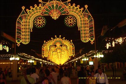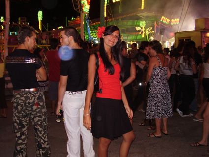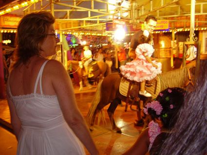 Sera Feria, la Feria per chi non lo sapesse è un sagron da paura che dura una settimana e coinvolge tutta Malaga...la gente del posto si veste e veste i bambini da gitani, si balla il flamenco e si bevono fiumi di tinto de verano e cartoja....si mangia la patata e si fa fiestaaaa, dura 24 ore: alla mattina e al pome fino alle 6 è in centro a Malaga e alla sera si sposta qui in Fiera...è una cosa gigantesca, enorme....ci sono tutti tendoni all’ inizio dove mangi le specialita’ (a prezzo moooolto caro) e poi una serie infinita di discoteche dove c’ è solo musica spagnola e latino americana, zero tunz tunz...dall’ altro lato c’ è un luna park gigante con giostre mai viste e per la mia felicità un mercatino: