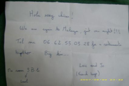 Alla sera tornate da Torremolinos ci siamo trovate la lettera dei francesi...sti sfigati erano tornati a Malaga per noi...ovviamente io....ho snobbato e sono rimasta in ostello mentre la guapa con me è uscita con il suo francesino