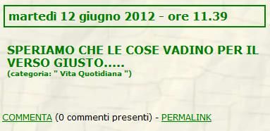 ![]() ![]() lunedì 10 settembre 2012 - ore 13:18 mah Sabato sera sono uscito con mia morosa e unaltra coppia. Io le odie ste uscite a quattro però ogni tanto mi toccano. Laltra coppia era composta da una mia carissima amica e dal suo nuovo fidanzato. Il tizio in questione, grandissima testa di cazzo, lavora in un concessionario audi (o bmw, bò!) ma il suo modo di parlare era questo: <<Perchè diocan, qualche cliente che diocan entra a vedere unauto diocan, spesso diocan sa già che diocan non la comprerà diocan, la guarda diocan solo per diocan farsi na pippa mentale diocan. Quelli che diocan se lo comprano davvero diocan il macchinone diocan lo capisci subito diocan. Entrano diocan, la guardano due minuti diocan e diocan la comprano in 5 minuti diocan! Diocan non stanno li tre ore diocan a pensarci diocan, la vedono e se gli piace diocan se la comprano diocan perchè la vogliono guidare subito diocan!>> In tre maledette ore che siamo stati fuori a bere qualcosa avrà detto circa 7 milioni di bestemmie. Sua morosa non fa na piega, probabilmente nemmeno lo ascolta anche se lei è atea e non si scandalizza. Io non sono certo uno che si scandalizza per qualche bestemmia ma questo era ossessivo! E poi danno a me del boaro! Comunque verso fine serata ho chiesto al tizio in questione se quando si rivolgeva ai clienti parlava in quel modo; la sua risposta è stata: <<Certo che no diocan!>> chissà, magari da piccolo faceva pure il chierichetto! LEGGI I COMMENTI (8) - PERMALINK martedì 4 settembre 2012 - ore 18:22 diolatte COMMENTA (0 commenti presenti) - PERMALINK sabato 18 agosto 2012 - ore 13:28 odio Ieri volevo far il bravo, ma dei coglioni mi hanno avvelenato la lemonsoda con il gin. Bastardi. LEGGI I COMMENTI (5) - PERMALINK venerdì 15 giugno 2012 - ore 16:15 ci penso.. Un amico è da due giorni che insiste per andar a mangiare l’aragosta in un ristorante non so dove in provincia di Venezia. Col cazzo! A parte che costa un patrimonio, e poi mi vien male all’idea di quelle povere aragoste gettate vive nell’acqua bollente! Che poi non ho ancora capito se davvero soffrono oppure no. Il sistema nervoso ce l’hanno pure loro, però non essendo biologo non saprei proprio cosa accade loro durante la bollitura. Qualcuno di voi sa se le aragoste bollite vive soffrono oppure no? LEGGI I COMMENTI (2) - PERMALINK martedì 12 giugno 2012 - ore 12:44 hahahahaha! I geni che popolano spritz.it ![]() ha ragione la fornero LEGGI I COMMENTI (7) - PERMALINK mercoledì 6 giugno 2012 - ore 16:04 prurito alle mani Ci son un bel po di persone nel mio quartiere a cui spaccherei volentieri le ginocchia, e ne sarei capace credetemi, a cominciare da quei ragazzini che han provato ad avvelenare il cane del mio vicino. LEGGI I COMMENTI (5) - PERMALINK lunedì 4 giugno 2012 - ore 12:05 premonizioni Ho scoperto che i pavoni allevati dal contadino che abita a circa 500 metri dal mio condominio sanno prevedere i terremoti, Infatti prima di ogni scossa fanno quel loro strano verso. Compresa ieri sera prima di quella leggera scossa. :/ Azz... COMMENTA (0 commenti presenti) - PERMALINK mercoledì 30 maggio 2012 - ore 10:01 Mah.. Io non dico riuscir a prevedere i terremoti o altro, ma almeno costruire strutture che non crollino dopo neanche due scosse.. E ci rimettono sempre gli onesti lavoratori, mai quei luridi politici corrotti ed inutili. LEGGI I COMMENTI (3) - PERMALINK martedì 22 maggio 2012 - ore 16:20 Sia chiaro.. Spritz.it mi piace. E abbandonato a se stesso e forse è anche questo il bello. Una sorta di zona anarchica, un po come quei nuclei di sopravvissuti in un mondo post apocalittico. Ovviamente quei beoti codardi sono le creature mutanti o gli zombie (che ultimamente van tanto di moda) che vanno eliminati a colpi di Uzi senza alcuna pietà! ![]() E nonostante sia superfluo specificare lo dico comunque: LEGGI I COMMENTI (4) - PERMALINK lunedì 21 maggio 2012 - ore 10:10 GULP! Sabato sera (o meglio notte) nell’istante in cui stavo rientrando a casa sento la terra tremare sotto i miei piedi e istintivamente mi giro e ritorno fuori in strada. Leggermente alticcio con l’alito che sbuffava vapori di birra slalom ho fumato almeno 10 sigarette prima di decidermi a tornare in casa, solo la mattina dopo ho realizzato che si era trattato di una piccola scossa di terremoto. Vacca troia! LEGGI I COMMENTI (5) - PERMALINK > > > MESSAGGI PRECEDENTI |