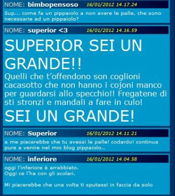 Il simpatico demente (o balena inchiavabile) che si diverte ad offendermi nei MIB senza aver le palle di presentarsi come si deve probabilmente ascolta vasco... Questo spiega moooooolte cose! ![]() aggiornamento delle 12:31 Avevo sformato la prima pagina di spritz ma ora grazie a dei bravi spritzini pare tornata normale. Ho fatto io la cagata e lo ammetto! ![]() cagheve doso! LEGGI I COMMENTI (6) - PERMALINK mercoledì 11 gennaio 2012 - ore 12:21 Oh bene, oggi pomeriggio tutti a casa perchè i tecnici devono smanettare coi computer! Olè! Sarei ancora a lavoro ma tanto è un momento morto, ho tempo per raccontarvi ciò che ieri mi ha fatto girar le palle a mille. Spero che i 4 lettori del mio blog siano felici di ciò ![]() Ieri ero tranquillo a lavoro quando squilla il cellulare, era un mio amico con cui stiamo progettando da circa 6 mesi un viaggio in Svezia. Io sono settimane che mi giostro le ore per riuscir ad accumulare abbastanza giorni di ferie. Almeno 10 giorni volevo prendermeli per veder la Svezia! Ultimamente non ci speravo neanche più dato che sto tizio è la persona più inaffidabile che io conosca, però ormai sembrava cosa fatta. Infatti quando questi m’ha chiamato io ho prenotato i biglietti d’aereo. Sembra quasi che il destino beffardo si sia piazzato sulla mia spalla perchè tempo 5 - 6 minuti dopo essermi arrivata la mail di conferma da ryanair questo mi chiama e mi dice di annullar tutto. Esterrefatto gli chiedo il motivo mentre a fatica trattenevo valanghe di bestemmie. Pensate solo che inizialmente eravamo in 3 a dover partire ma uno ha rinunciato perchè suo padre è malato e non escludeva la possibilità che potesse andarsene mentre lui era in vacanza; lo capisco. Ma quell’altro, porcamadonna, mi dice che non se la sente più perchè negli ultimi mesi ha dei dolori alla gamba e al bacino e il suo massaggiatore di fiducia è libero solo a marzo! In soldoni mi ha detto che ha riflettuto in quei 5 -6 minuti e ha deciso che non ne valeva la pena di visitar la Svezia con quel dolorino alla gamba, povera fottuta mezza sega! Io ora mi ritrovo con 4 biglietti di andata e ritorno per stoccolma e non ci penso neanche ad andarci da solo, col cazzo! Ero talmente incazzato che non mi son manco informato se sono rimborsabili o meno! LEGGI I COMMENTI (9) - PERMALINK martedì 10 gennaio 2012 - ore 14:17 andate a cagare LEGGI I COMMENTI (5) - PERMALINK sabato 7 gennaio 2012 - ore 10:02 Ee feste xe finìe e ne toca tornar a lavoro! Ho già voglia di darmi fuoco! Speriamo succeda qualcosa di stimolante! Tipo il soffitto che crolla sul mio capoufficio, il mio computer che esplode (magari senza che gli stia davanti), un mini tornado che devasta tutto e tutti (sempre magari quando io non sono presente) o un toro imbizzarrito che irrompe negli uffici seminando il panico tra gli impiegati. Uah uah uah! Certo che gli spagnoli son dei rincoglioniti però eh!! LEGGI I COMMENTI (2) - PERMALINK lunedì 2 gennaio 2012 - ore 15:33 Quanto zoccola devessere una del genere secondo voi? Quando la zoccolaggine è genetica lo si vede subito LEGGI I COMMENTI (6) - PERMALINK venerdì 30 dicembre 2011 - ore 11:39 orcocazzzxxxxxxzzzzo LEGGI I COMMENTI (2) - PERMALINK lunedì 26 dicembre 2011 - ore 21:17 Dire che ho mangiato come un brontosauro è alquanto riduttivo. E pensare che uno di questi giorni andrò al ristorante messicano, e poi c’è il cenone dell’ultimo dell’anno, poi quello del primo dell’anno!!! Sti 3 - 4 chili che ho perso li avrò già ripresi con gli interessi! keep on rockin’... LEGGI I COMMENTI (2) - PERMALINK domenica 25 dicembre 2011 - ore 11:15 BUON NATALE A TUTTI!!! ![]() LEGGI I COMMENTI (1) - PERMALINK > > > MESSAGGI PRECEDENTI |