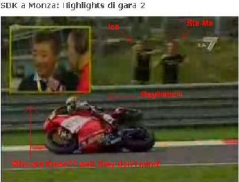 ecco, noi siamo le due macchie nere dietro la rete..non quei due nel riquadrino giallo eh! cmq sempre con un pò di fantasia si può vedere ice che smanando incita bayliss mentre io irrompo con una sanissima esclamazione di gaudio..inizia con la P e finisce con la o, composta da due parole: un nome comune di animale e un nome proprio di dio... MUAHUAHUAHAHUAHAHUAU DUCATI A CANNONE FORZA POMPONEEEEEEEEEEEEE