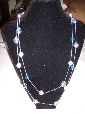 COLLANA DOPPIO GIRO CON PIETRE VETRO AZZURRI E SPIRALI E PALLINE IN METALLO