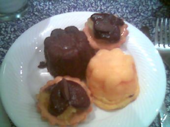 canelè di latte con vaniglia e fiori darancio, canelè al cioccolato, biscottini di frolla con composta di mele e cioccolato