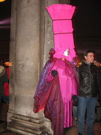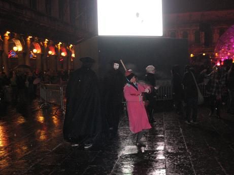 Poi, tutto ad un tratto.., si spengono le luci sulla piazza, si accendono gli amplificatori e le luci stroboscopiche, la corrente arriva alle casse.., e tutta San Marco diventa una Mega-Discoteca, il tutto sotto una bella pioggerellina..