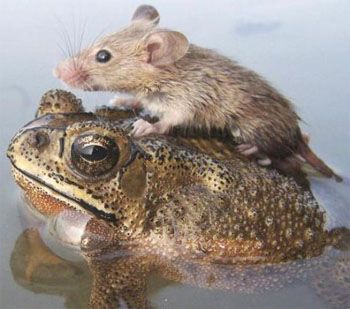 "Un topino accetta un passaggio da una rana, nella città di Lucknow inondata in India"