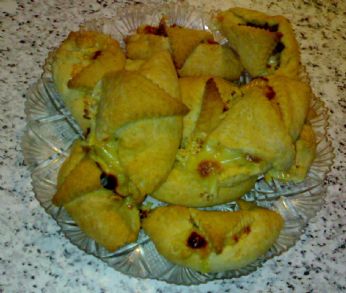 e impastate finchè non viene una bella palla unta, stendete la pasta più sottile che potete, tagliatela in triangoli. il ripieno potete metterlo dentro come volete: a cubetti o tutto tritato tipo pappetta.. mettetelo nella parte centrale dei triangoli (non esagerate, altrimenti poi non riuscirete neanche a chiudere i cornetti) e arrotolateli avendo cura di premere bene le estremità per evitare la fuoriuscita del formaggio (le cose scure in foto).. metteteli nella parte media del forno preriscaldato a 200gradi per circa mezz’ora e...