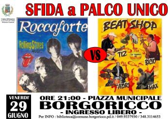 Continua il nostro "Summer Tour" 2012 con un importante e simpatico appuntamento che si terrà venerdì 29 giugno a Borgoricco (PD) sulla piazza municipale: sarà uno di quegli avvenimenti che potrebbe avere un senso da com’è stato pensato, ovvero, una sfida dal carattere ovviamente goliardico tra Beatles e Rolling Stones combattuta a suon di canzoni tra i BEAT SHOP (noi medesimi) e i nostri amici, nonché pupilli, ROCCAFORTE. Sul palco, diviso idealmente a metà, verrà allestito un doppio set di strumenti con i ROCCAFORTE a destra e i BEAT SHOP a sinistra.. Questo non per riferimenti politici, bensì per piazzare meglio le due batterie essendo il loro batterista mancino, poichè servirebbe a dare al pubblico un miglior effetto a “specchio”.