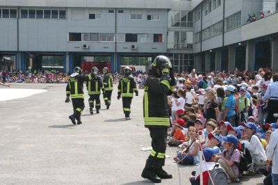 Oggi dalle 10:00 alle 12.30 ci sarà una folla festante di bimbi, circa 3000, che si divertiranno a vedere lesercitazione con scale - fuoco - acqua - interventi simulati - incendio della casetta che i bambini stessi, con lausilio dei pompieri, spegneranno