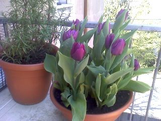 finalmente sono sbocciati i tulipani che mi ha regalato la mia e inquilina... Dovevano essere viola e neri ma sono sbocciati solo i viola. Secondo me i fiori non sono programmati per nascere neri. Sono contro natura!