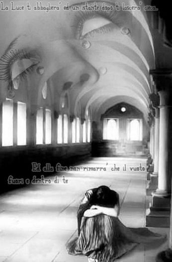 1) Rendersi conto di essere soli... Di aver avuto accanto un Angelo... E di averlo ucciso... Di aver sbagliato e di non poter tornare indietro... Vivere sospesi tra l'indecisione e la paura... Ogni giorno ti svegli e lei nn c'è... e così per sempre... ti svegli, ma in realta dormirai per sempre senza lei accanto... Vivi la vita con una maschera per nn far vedere a chi ti stai accanto che in realta sei morto... Ti circondi di persone che nn ti conoscono perché loro nn possono vedere che hai perso la felicità... Un giorno era venuto un angelo per me e io l'ho ucciso... Nn ti scorderò mai Piccola...