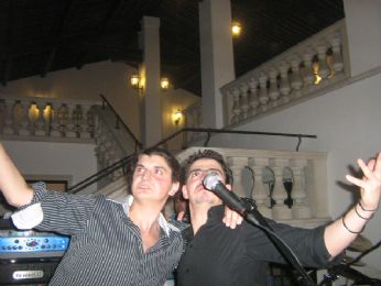 Livio e Matteo con un microfono nel naso. Curiosità: Livio passò tutto il ricevimento in infradito: Livio è un uomo coerente, e pure di sani principi.. Avete scritto a amorecavejo nel frattempo? Ma ce l’avete un cuore?