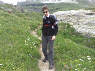 - arrivo a Gressoney St.Jaques, Val dAosta, 1400m - salita ripidissima tagliagambe tagliafiato pazzescamente faticosa con due sacche in spalla - arrivo nel villaggio walser di Alpenzu + rifugio, 1800m - risotto ai porcini con fontina, salsiccie e lardo di arnad - partenza mattina dopo da Alpenzu, gambe in spalla. Arrivo dopo 4 ore alla sommità del Colle Pinter, 2800 metri. Dislivello di 1000 metri con tanto di attraversata degli alpeggi e dribbling a mucche e capre, guado dei torrenti, arrampicata nelle pietraie, arrampicata nei nevai. La vetta è completamente innevata (a breve foto)