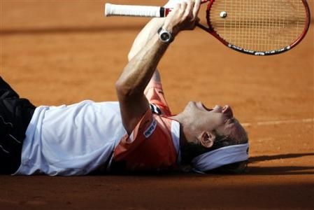 Mi sembra però doveroso spendere due parole per un’impresa che rimarrà nella storia. Filippo Volandri, livornese, 25 anni, n.53 nel ranking ATP, non era nemmeno nato quando Panatta, nel 1978, raggiunse la semifinale nel Masters Series di Roma per poi arrivare in finale e perdere in 5 set da un certo Borg. Da allora nessun italiano c’era più riuscito a Roma e in assoluto un azzurro non raggiungeva la semifinale di un Masters Series dal 1995 (Gaudenzi a Montecarlo). Lui ce l’ha fatta, eliminando il n.13 del ranking Gasquet, il n.12 Berdych e soprattutto il n.1, il più forte di tutti, Roger Federer che rispetto a due anni fa è migliorato moltissimo sulla terra (l’anno scorso, sempre a Roma, perse finale in 5 set contro Nadal che gli annullò un match point). Ieri purtroppo non c’è stato niente da fare: Gonzalez, numero 6 al mondo, ha giocato benissimo senza concedere niente a Volandri che non è riuscito a colmare il netto divario. Ma la sua impresa rimarrà nella storia di questo sport. Grazie PIPPO! Immagini come queste nessuno potrà mai cancellarle dalla mia memoria!!!