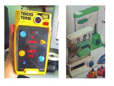 Il tricky trars credo di averlo consumato a forza di giocarci, il bello è che è un gioco stupidissimo eppure c’ho perso ore e ore; alla fine come ogni bambino della mia eta l’ho smontato completamente per poi buttarno in quanto non ero più capace di ricostruirlo ..... e poi io volevo la calamita che c’era dentro. Il gioco a destra non ho idea di cosa sia.