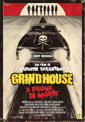 Non sono un grande intenditore di film e sinceramente nn ho la più pallida idea di quanti e soprattutto quali film abbia diretto Quentin Tarantino, xò oggi sono andato a vedere "Grindhouse - A prova di morte" e devo dire ke sebbene suggestivo, coinvolgente e ricco di scene d’azione la storia nn è mai molto chiara... A parte la trama sadica alla Stanley Kubrick, le scene stile anni ’70-’80 si mischiano con prodotti moderni e i colori balzano dal bianco-nero al colore senza una motivazione logica... Kurt Russel, il protagonista del film, interpreta Stuntman Mike, un pazzoide ke si diverte ad ammazzare le ragazze con la sua macchina.