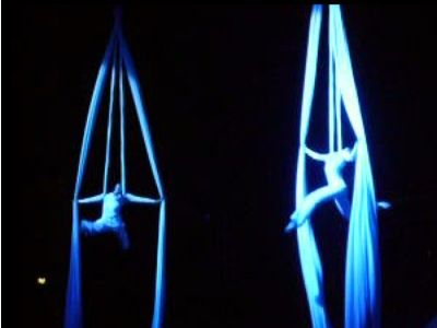 I primi erano allinterno di una gabbia, mentre i secondi erano legati semplicemente ad una sorta di lenzuolo.... assurdo, ma molto bravi!