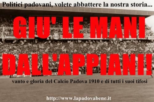 "Lapadovabene.it" si fa promotore di diffondere il malcontento di tutti quei tifosi che ritengono che lAppiani sia un monumento storico della città e che non vada abbattuto, ma casomai ristrutturato e riutilizzato. Forse servirà a poco, nel senso che questa giunta ha già dimostrato di agire senza alcun rispetto per i cittadini. Almeno servirà per liberarsi di loro alle prossime elezioni. Rimane il fatto che: LAPPIANI E CASA NOSTRA E NON SI TOCCA!
